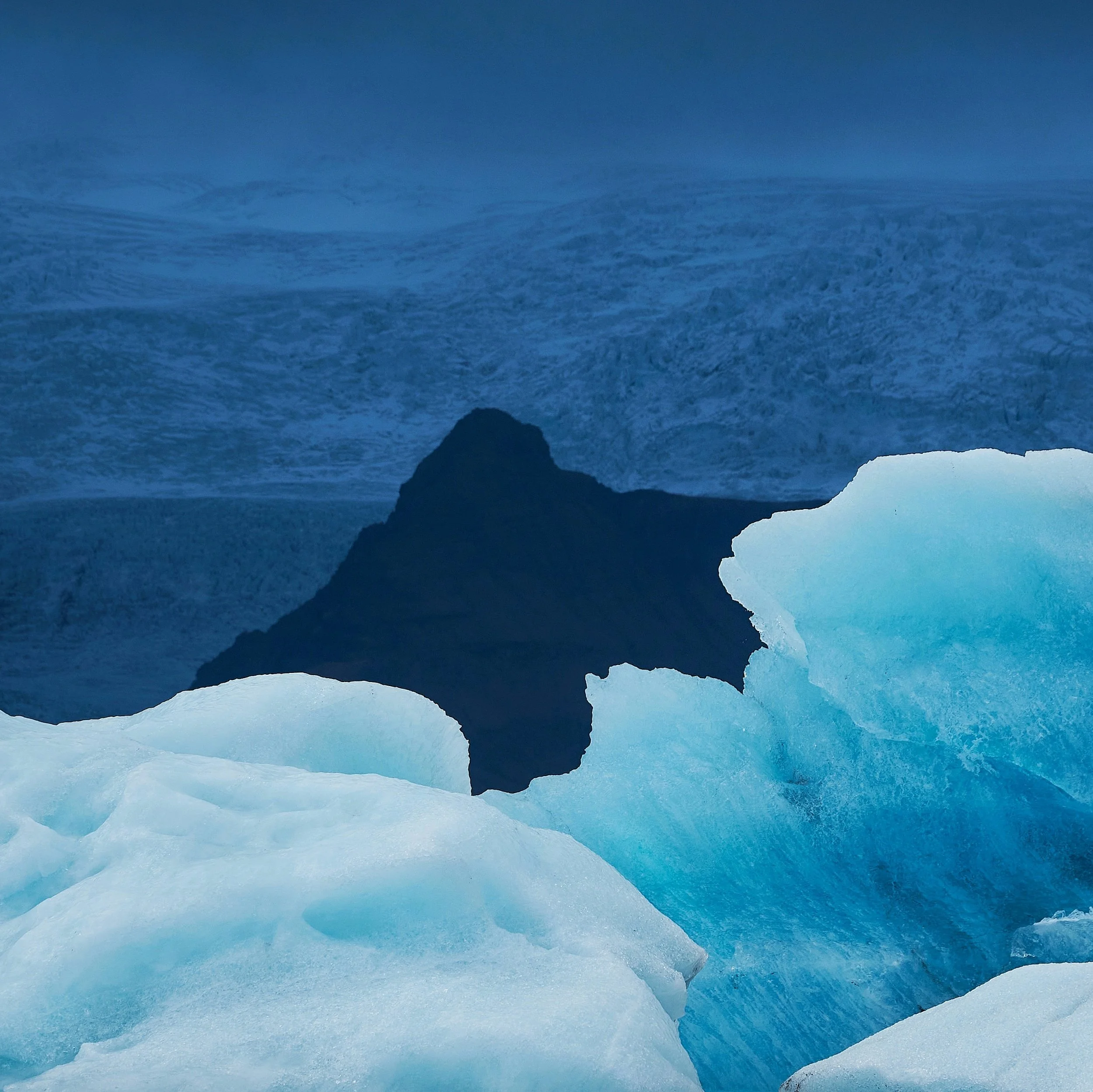 Chunks of Ice split and mollify into two shapes one with sharp ridges and the other a smooth glossy lump. The solitary mountainous terrain looms over the icy waters beneath, veiled with a dark silhouette as it spectates the heavy icebergs plunge into the currents of the ocean deep.